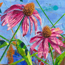 I have always loved the crisp lines and bold images that can be created by piecing together shapes of cut or ripped vividly colored paper. Before forming my images I use acrylic paint to add color and texture to the paper to allow for dynamic, one of a kind materials with which to assemble my images. I also use acrylic paint pens to add some of the details or lines onto of the paper shapes. Each mixed media piece is affixed to a wood backing for durability, and framed in a black floater frame ready to hang. For additional information, please click on each image.